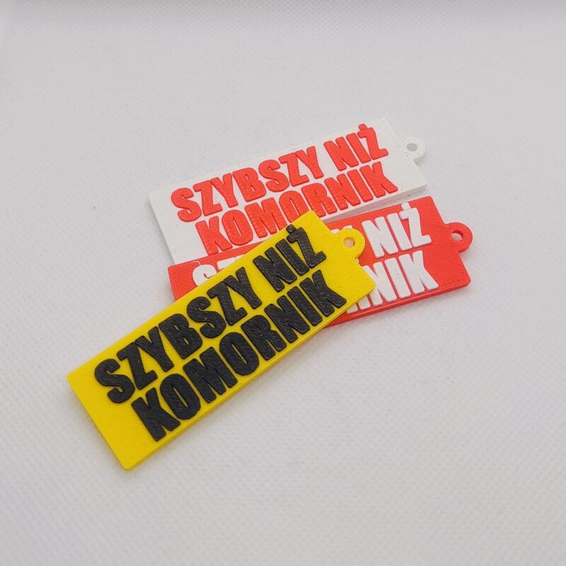 Brelok rolniczy z napisem „SZYBSZY NIŻ KOMORNIK”. Wykonany z wytrzymałego plastiku PLA metodą druku 3D. Idealny gadżet dla rolnika lub praktyczny prezent.