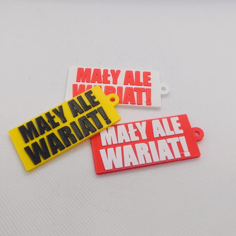 Brelok rolniczy z napisem „MAŁY ALE WARIAT!”. Wykonany z wytrzymałego plastiku PLA metodą druku 3D. Idealny gadżet dla rolnika lub praktyczny prezent.