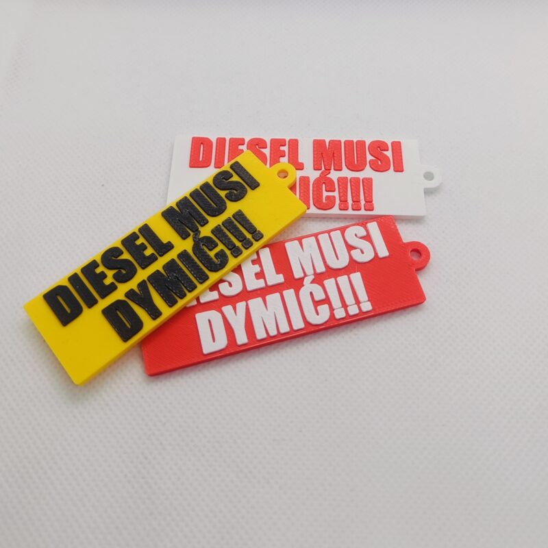 Brelok rolniczy z napisem „DIESEL MUSI DYMIĆ!!!”. Wykonany z wytrzymałego plastiku PLA metodą druku 3D. Idealny gadżet dla rolnika lub praktyczny prezent.