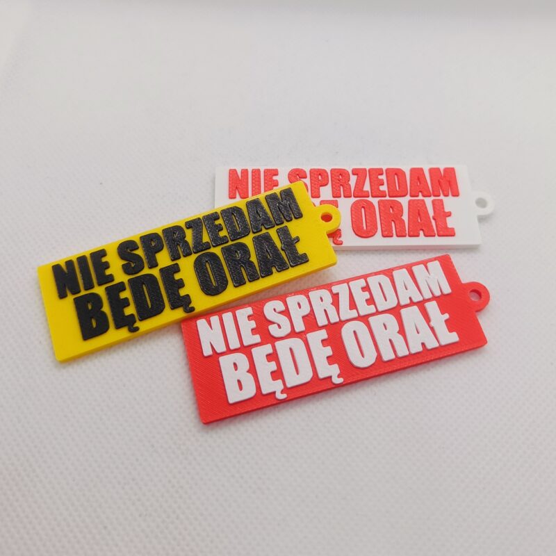 Brelok rolniczy z napisem „NIE SPRZEDAM BĘDĘ ORAŁ”. Wykonany z wytrzymałego plastiku PLA metodą druku 3D. Idealny gadżet dla rolnika lub praktyczny prezent.