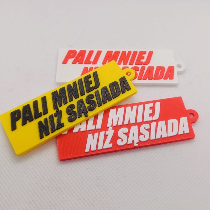 Brelok rolniczy z napisem „PALI MNIEJ NIŻ SĄSIADA”. Wykonany z wytrzymałego plastiku PLA metodą druku 3D. Idealny gadżet dla rolnika lub praktyczny prezent.