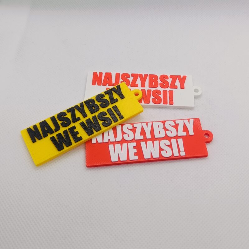 Brelok rolniczy z napisem „NAJSZYBSZY WE WSI!!”. Wykonany z wytrzymałego plastiku PLA metodą druku 3D. Idealny gadżet dla rolnika lub praktyczny prezent.