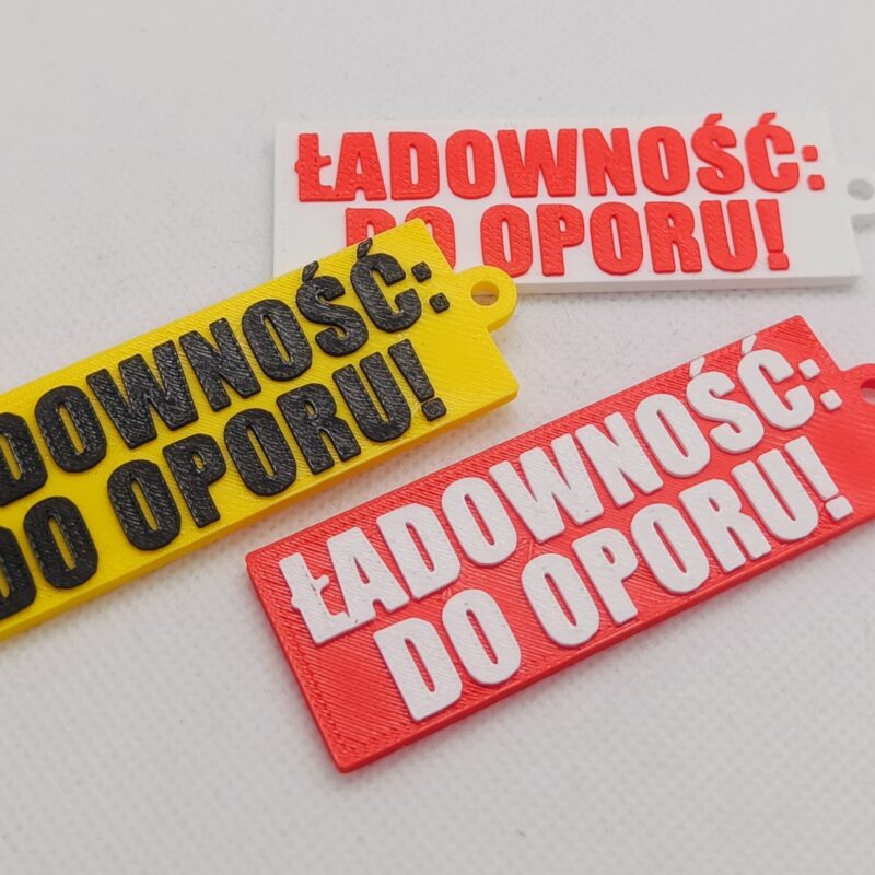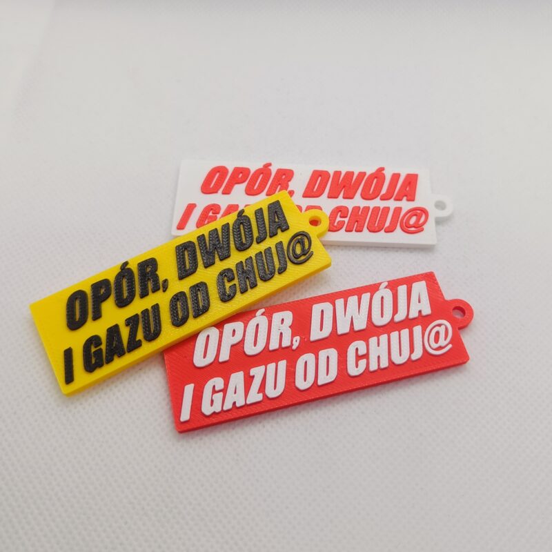 Brelok rolniczy z napisem „OPÓR, DWÓJA I GAZU DO CHUJ@”. Wykonany z wytrzymałego plastiku PLA metodą druku 3D. Idealny gadżet dla rolnika lub praktyczny prezent.