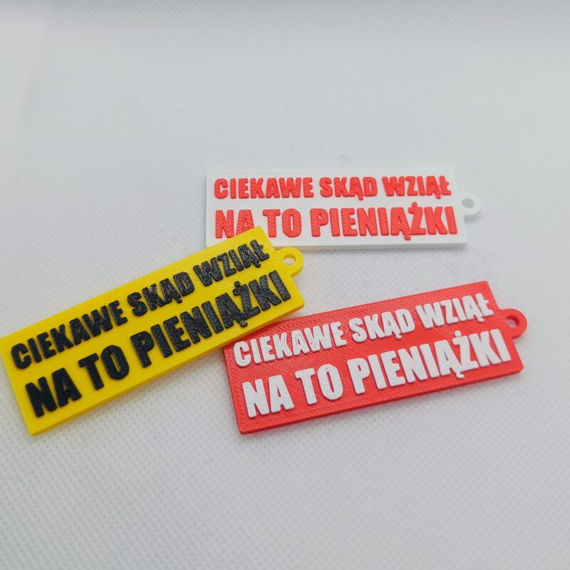 Brelok rolniczy z napisem „CIEKAWE SKĄD WZIĄŁ NA TO PIENIĄŻKI”. Wykonany z wytrzymałego plastiku PLA metodą druku 3D. Idealny gadżet dla rolnika lub praktyczny prezent.