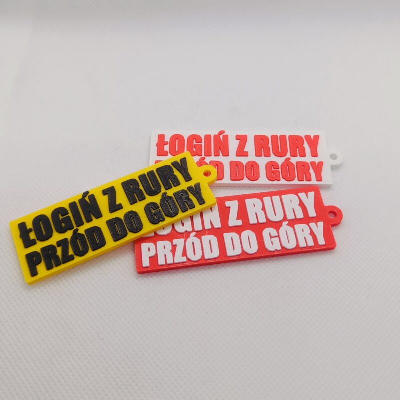 Brelok rolniczy z napisem „ŁOGIŃ Z RURY PRZÓD DO GÓRY”. Wykonany z wytrzymałego plastiku PLA metodą druku 3D. Idealny gadżet dla rolnika lub praktyczny prezent.