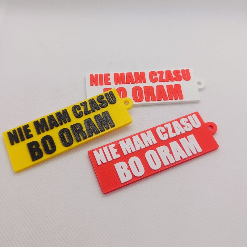 Brelok rolniczy z napisem „NIE MAM CZASU BO ORAM”. Wykonany z wytrzymałego plastiku PLA metodą druku 3D. Idealny gadżet dla rolnika lub praktyczny prezent.