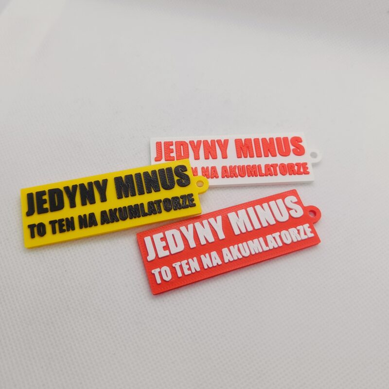 Brelok rolniczy z napisem „JEDYNY MINUS TO TEN NA AKUMULATORZE”. Wykonany z wytrzymałego plastiku PLA metodą druku 3D. Idealny gadżet dla rolnika lub praktyczny prezent.