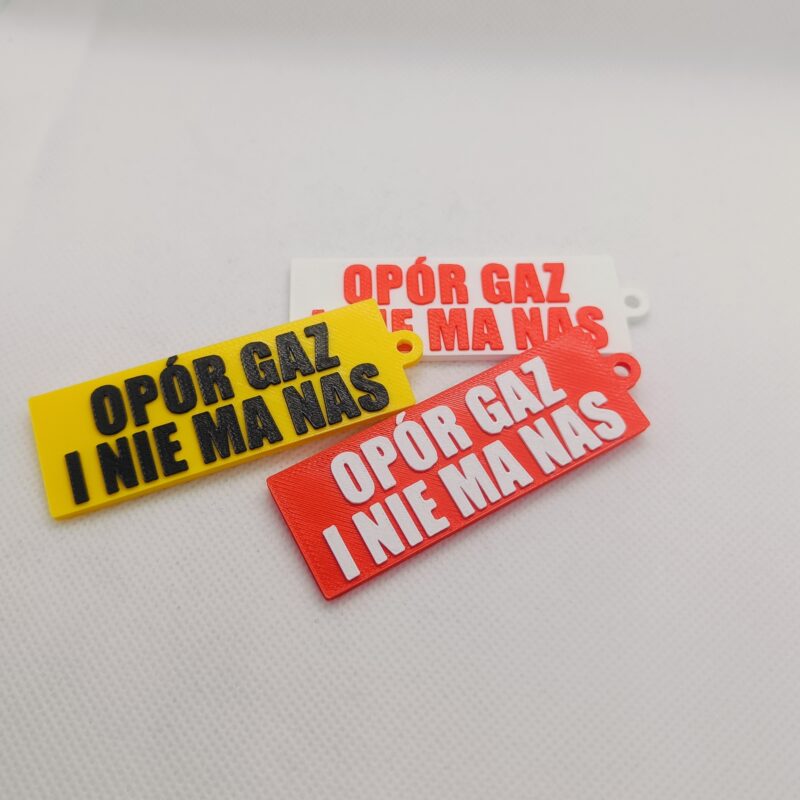 Brelok rolniczy z napisem „OPÓR GAZ I NIE MA NAS”. Wykonany z wytrzymałego plastiku PLA metodą druku 3D. Idealny gadżet dla rolnika lub praktyczny prezent.