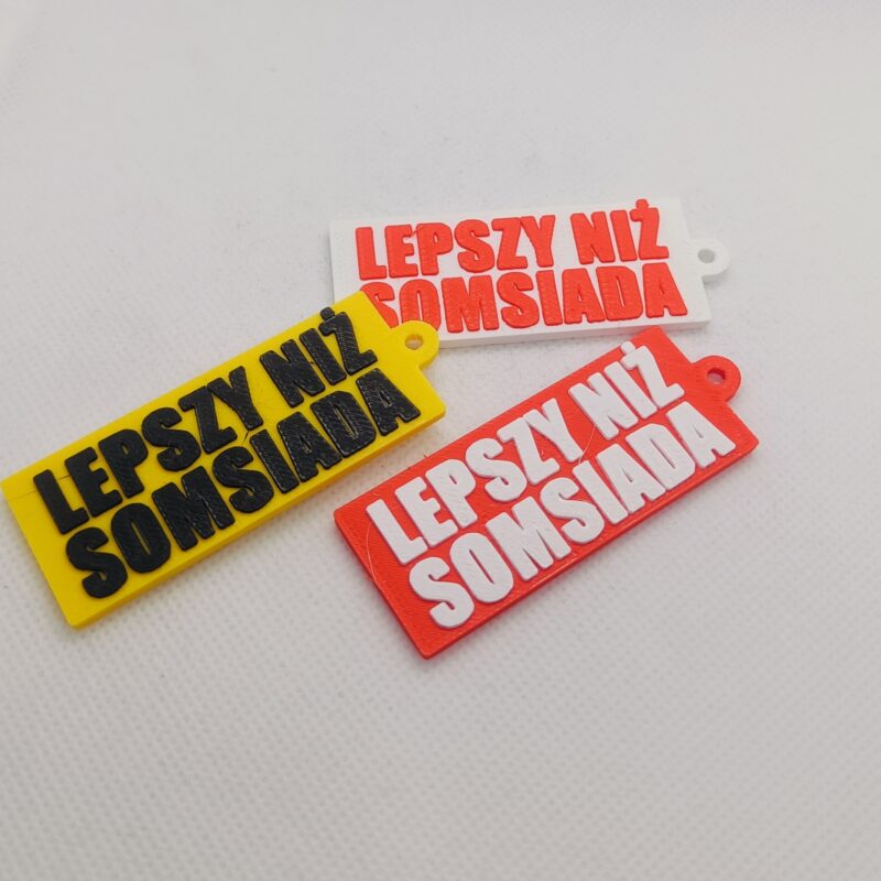 Brelok rolniczy z napisem „LEPSZY NIŻ SĄSIADA”. Wykonany z wytrzymałego plastiku PLA metodą druku 3D. Idealny gadżet dla rolnika lub praktyczny prezent.