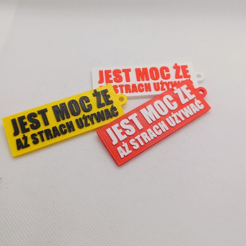 Brelok rolniczy z napisem „JEST MOC ŻE AŻ STRACH UŻYWAĆ”. Wykonany z wytrzymałego plastiku PLA metodą druku 3D. Idealny gadżet dla rolnika lub praktyczny prezent.