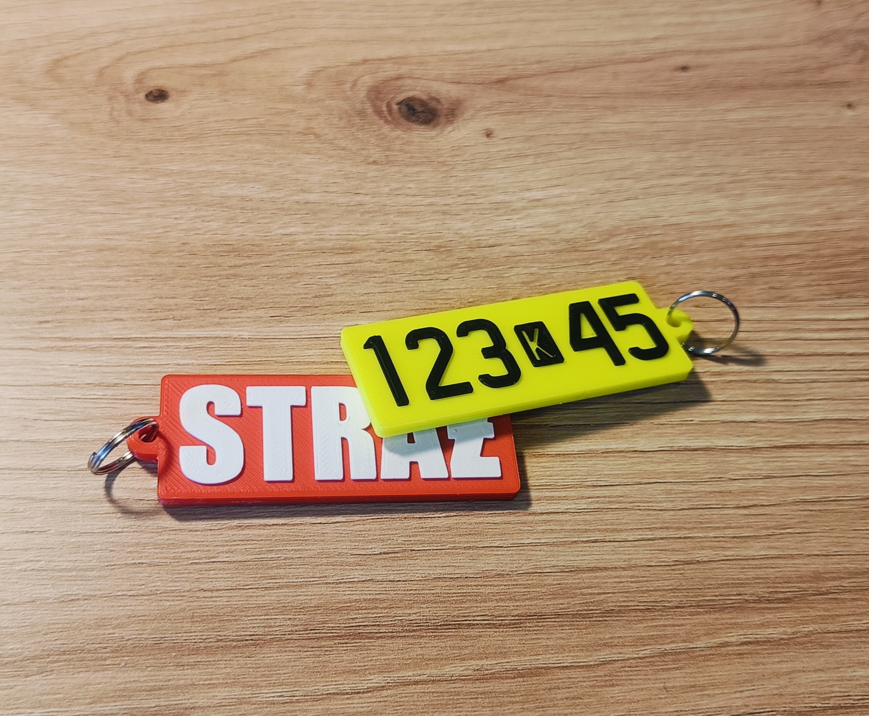 Na jednej stronie znajduje się napis STRAŻ, a na drugiej numery operacyjne pojazdu – dzięki temu brelok idealnie sprawdzi się w codziennej służbie, pomagając szybko zidentyfikować właściwy komplet kluczy.