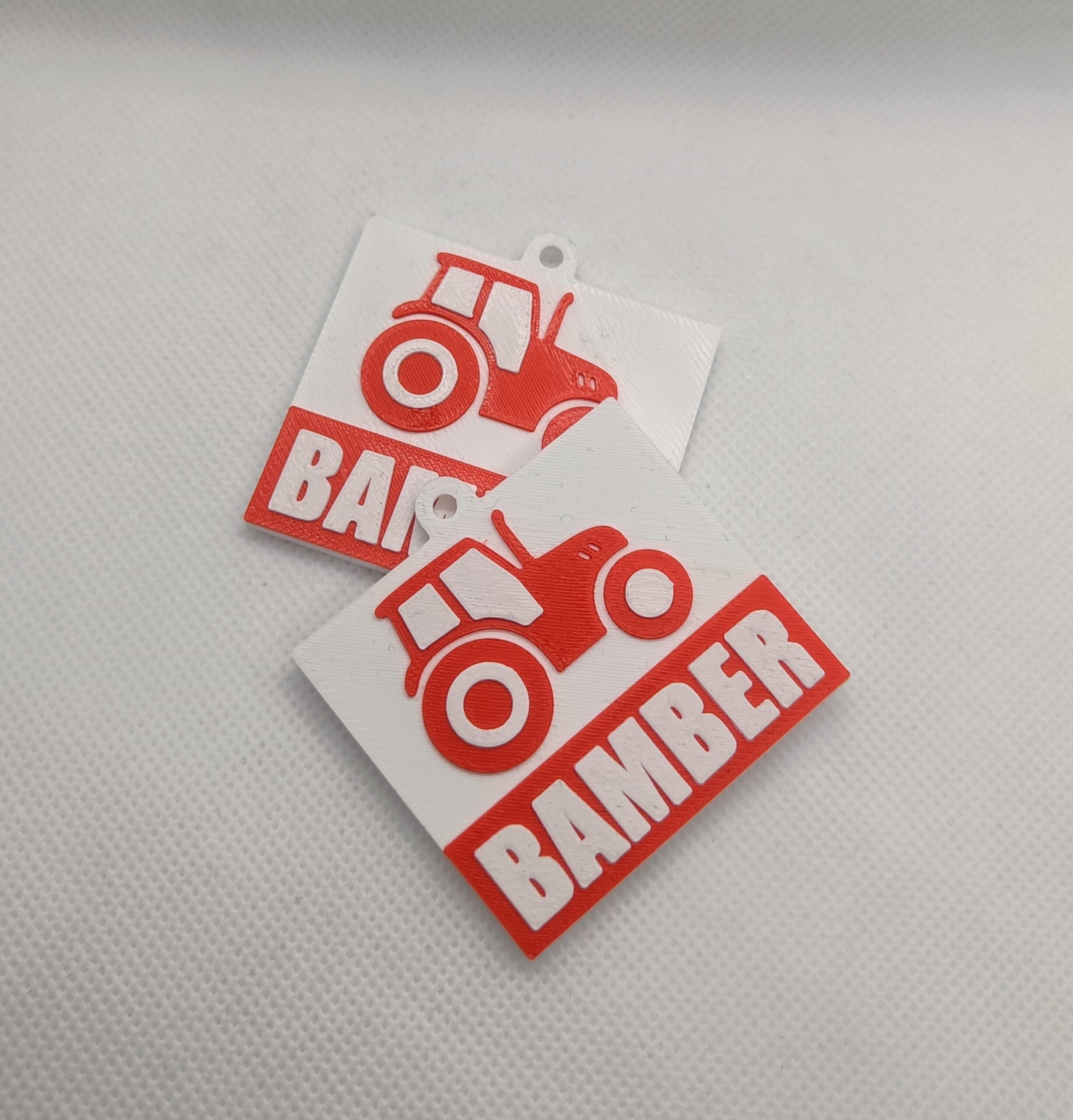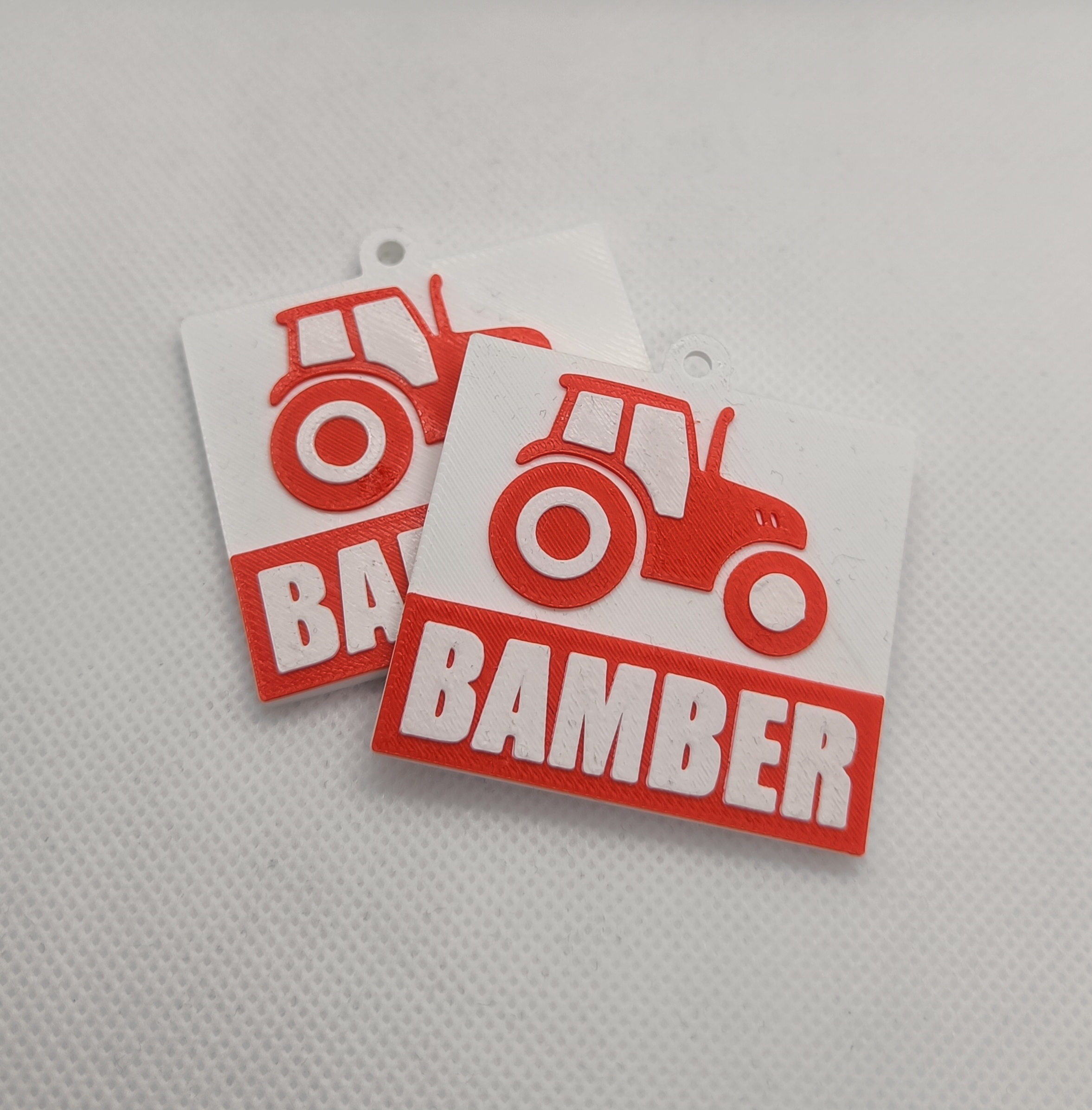 Oryginalny brelok rolniczy z napisem BAMBER, wykonany w technologii druku 3D z wytrzymałego plastiku PLA. Idealny do kluczy od ciągnika, maszyn rolniczych czy gospodarstwa.