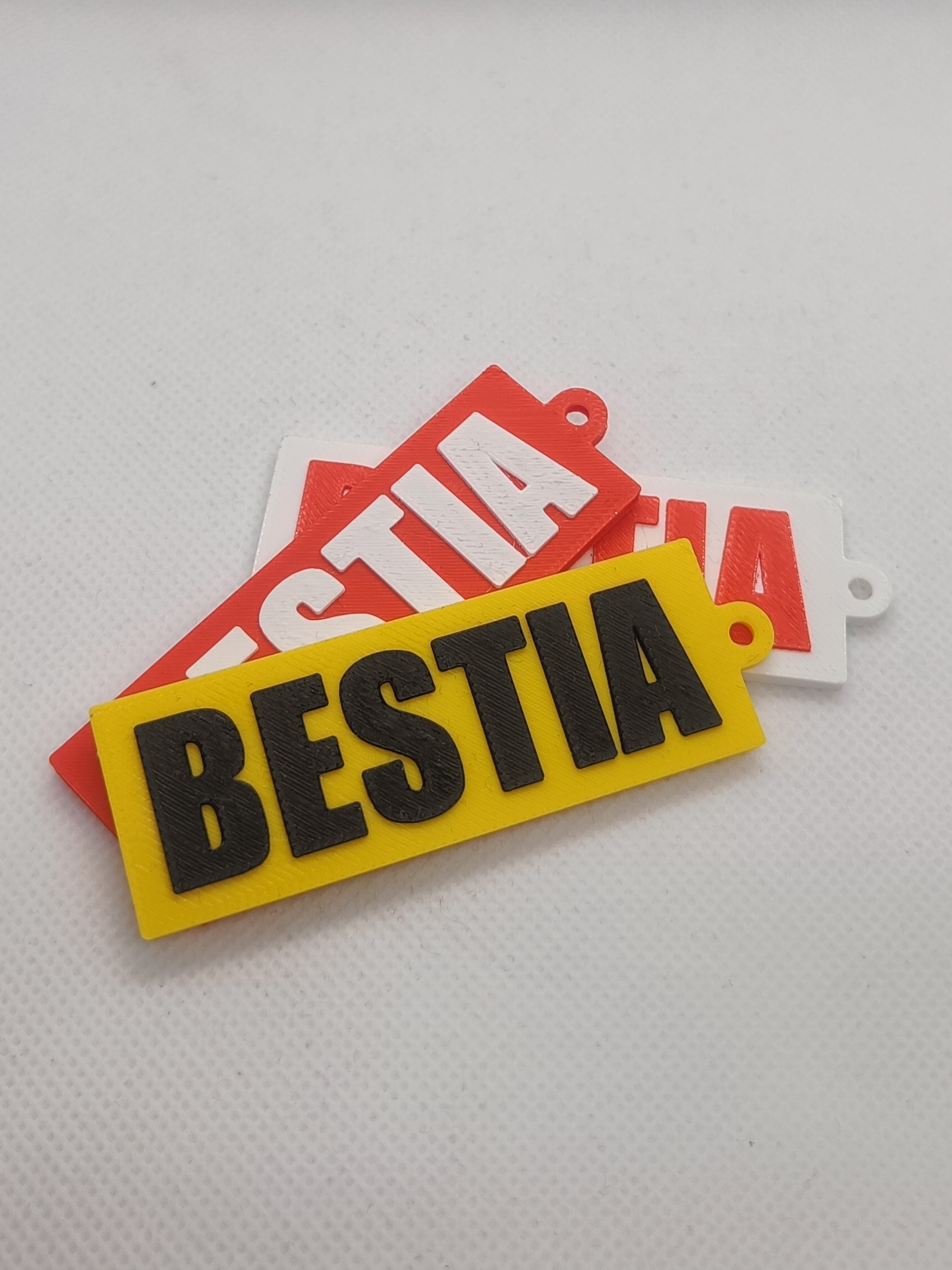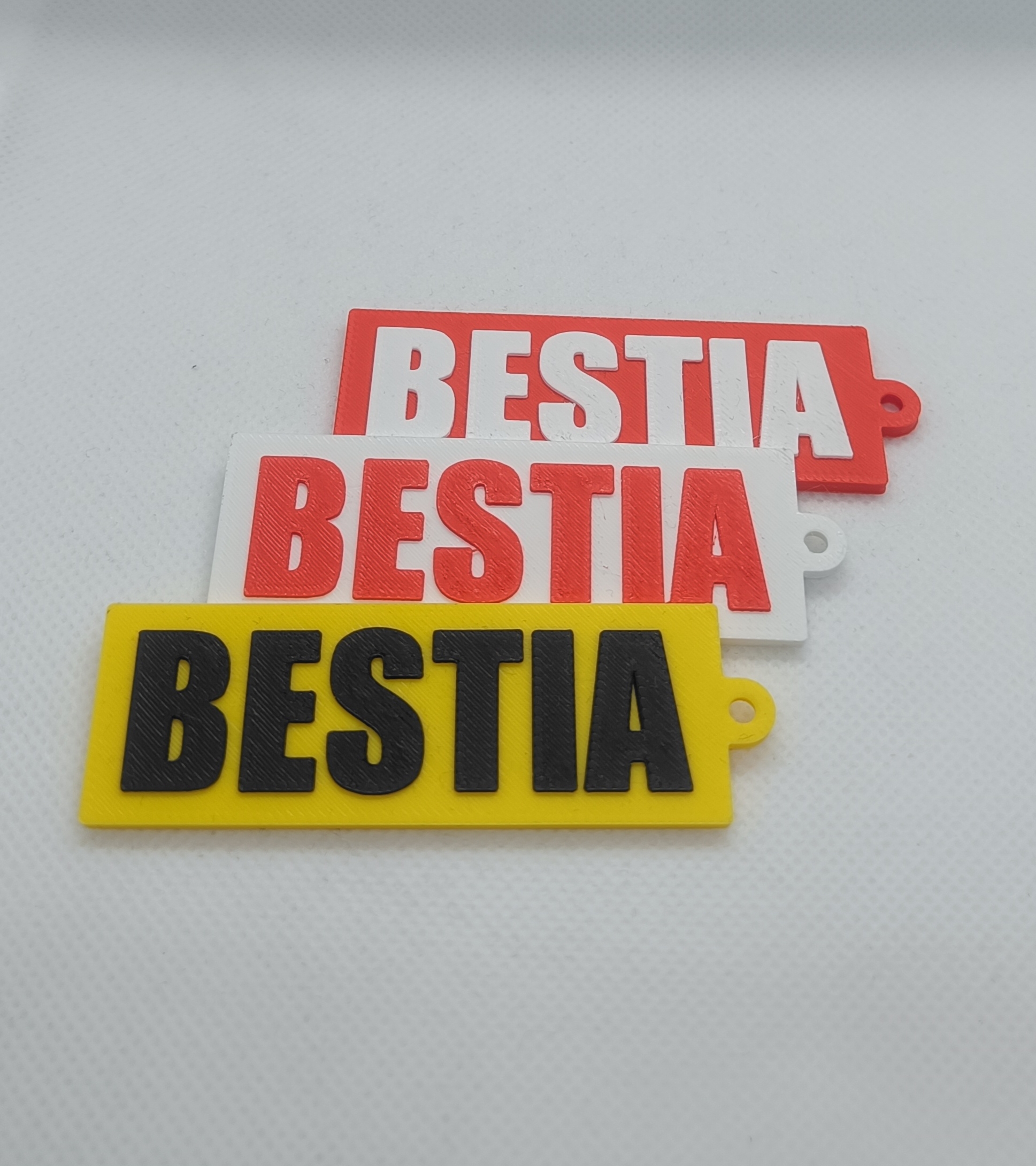 Brelok rolniczy z napisem „BESTIA”. Wykonany z wytrzymałego plastiku PLA metodą druku 3D. Idealny gadżet dla rolnika lub praktyczny prezent.