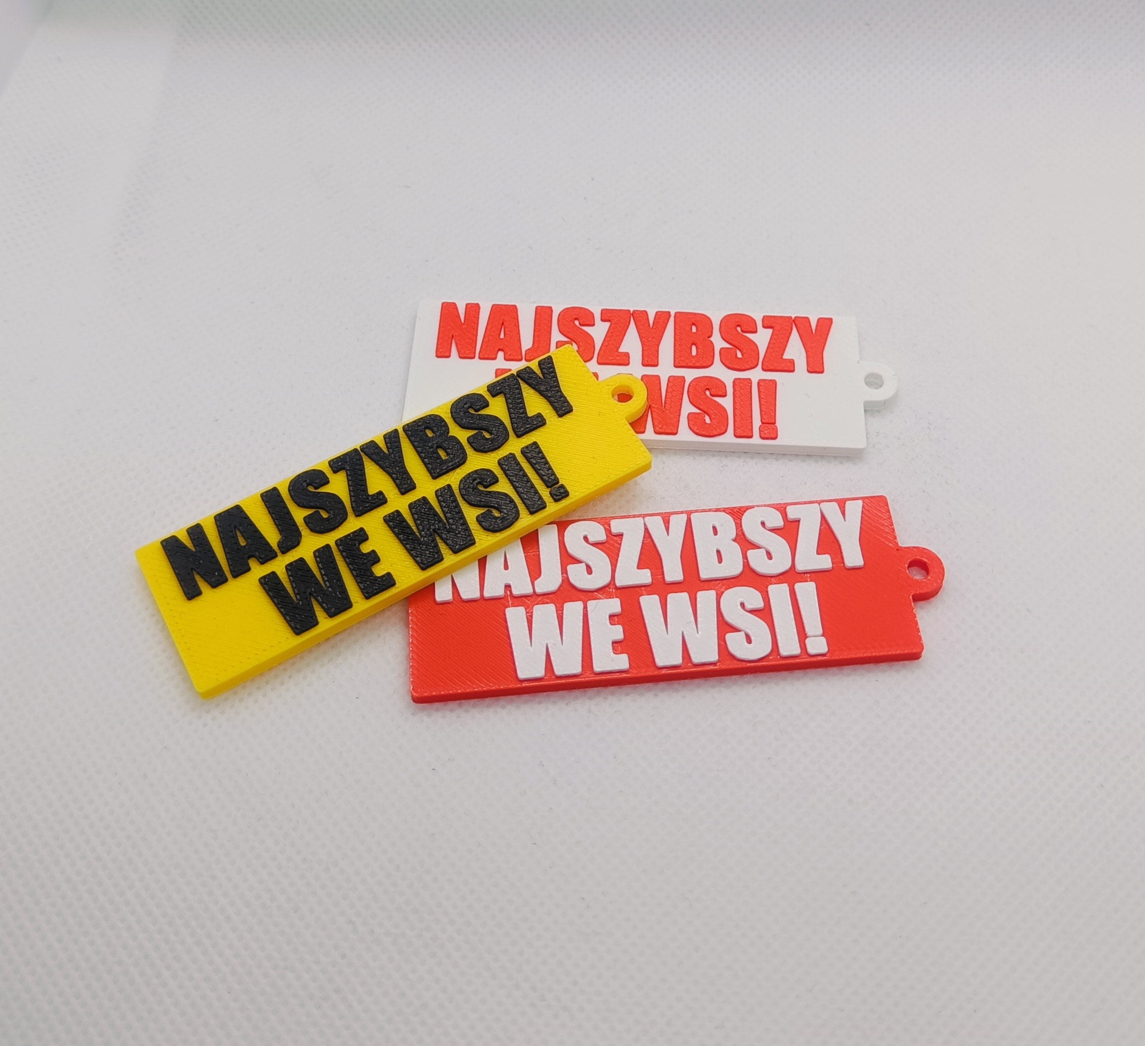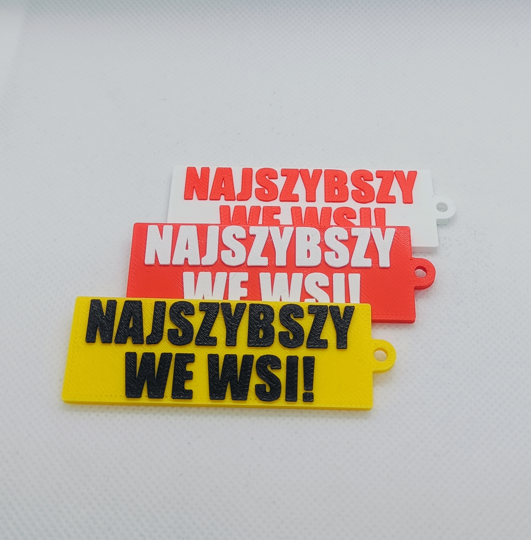 Brelok rolniczy z napisem „NAJSZYBSZY WE WSI!!”. Wykonany z wytrzymałego plastiku PLA metodą druku 3D. Idealny gadżet dla rolnika lub praktyczny prezent.