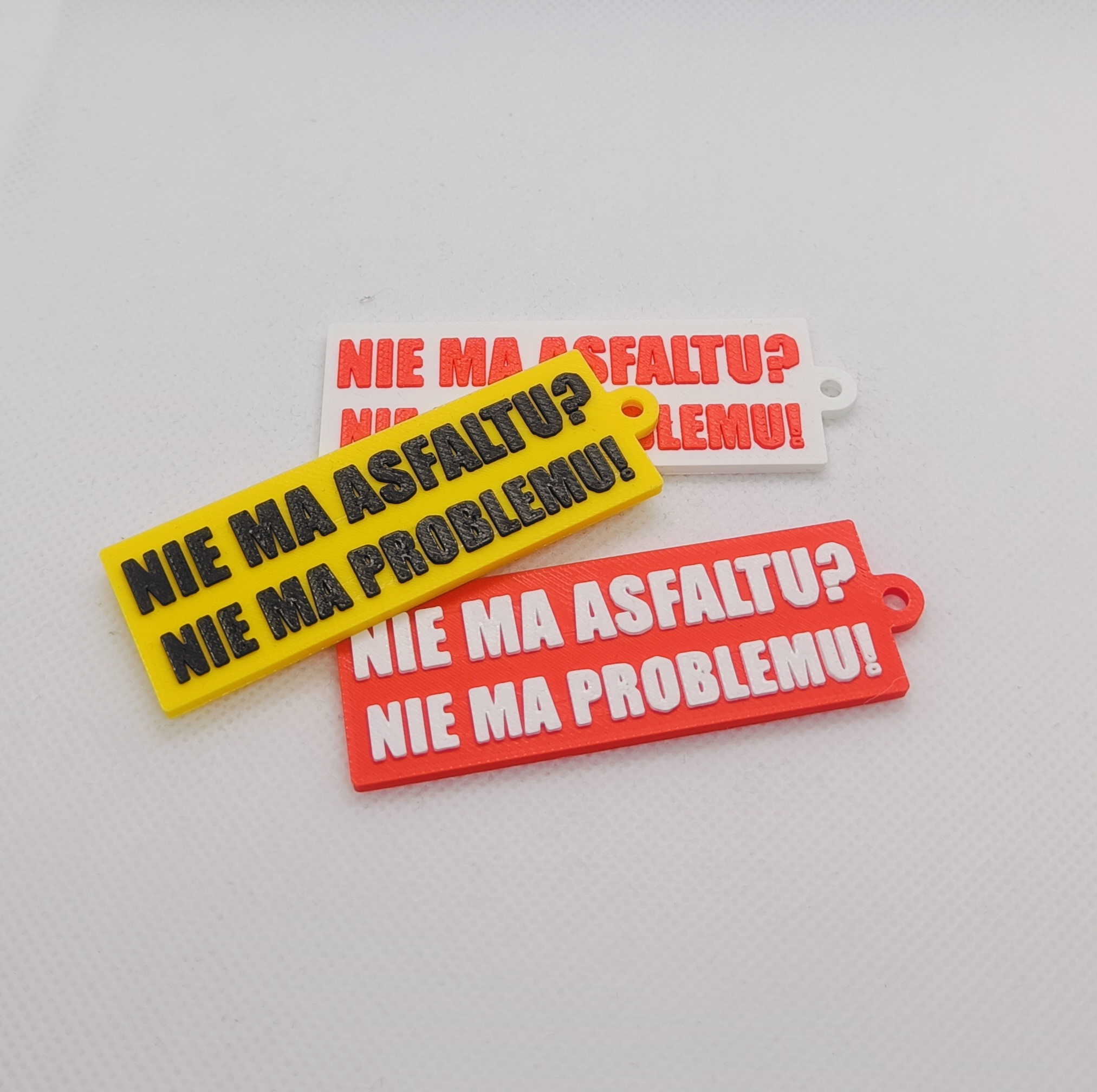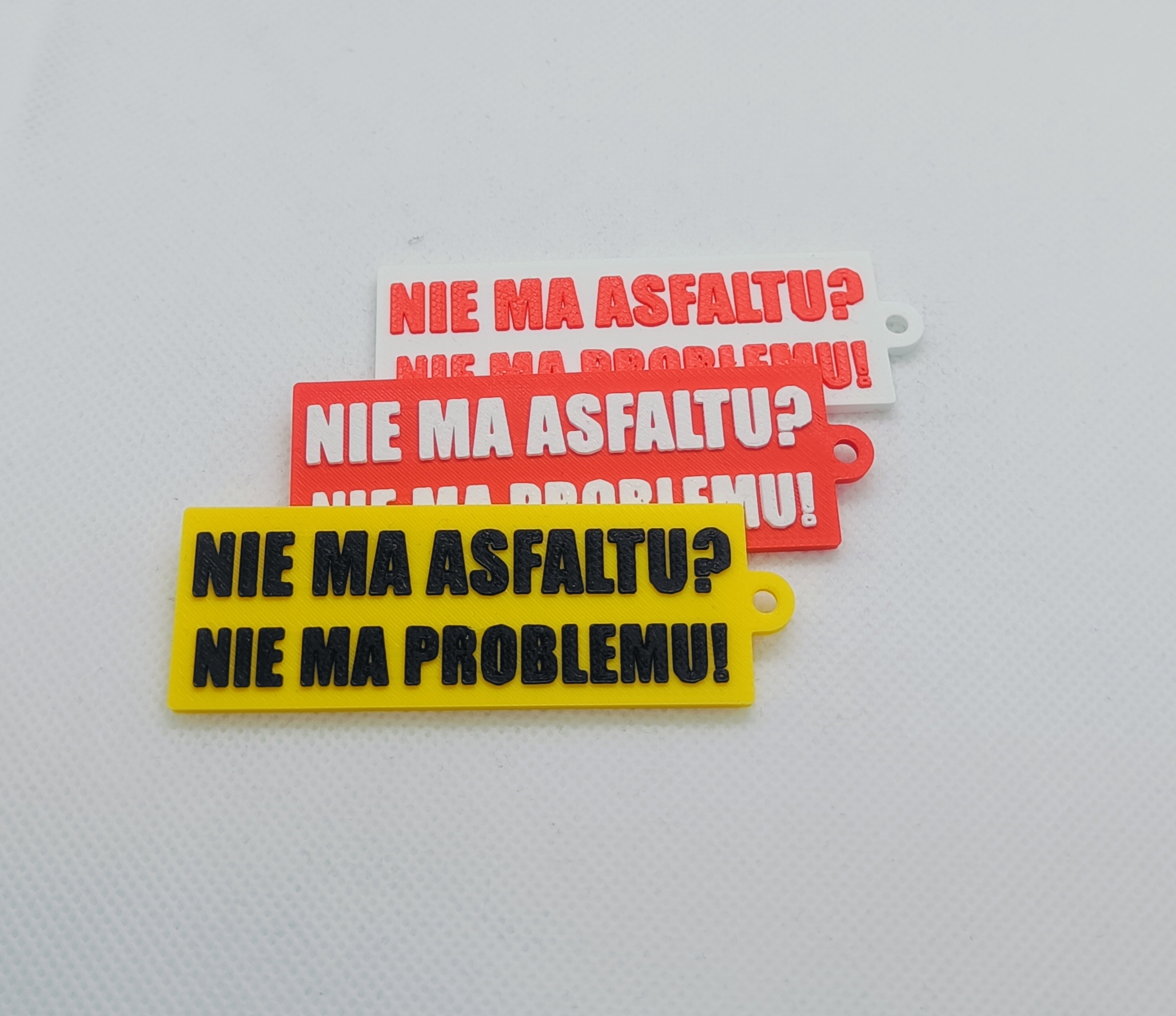 Brelok rolniczy z napisem „NIE MA ASFALTU? NIE MA PROBLEMU!”. Wykonany z wytrzymałego plastiku PLA metodą druku 3D. Idealny gadżet dla rolnika lub praktyczny prezent.
