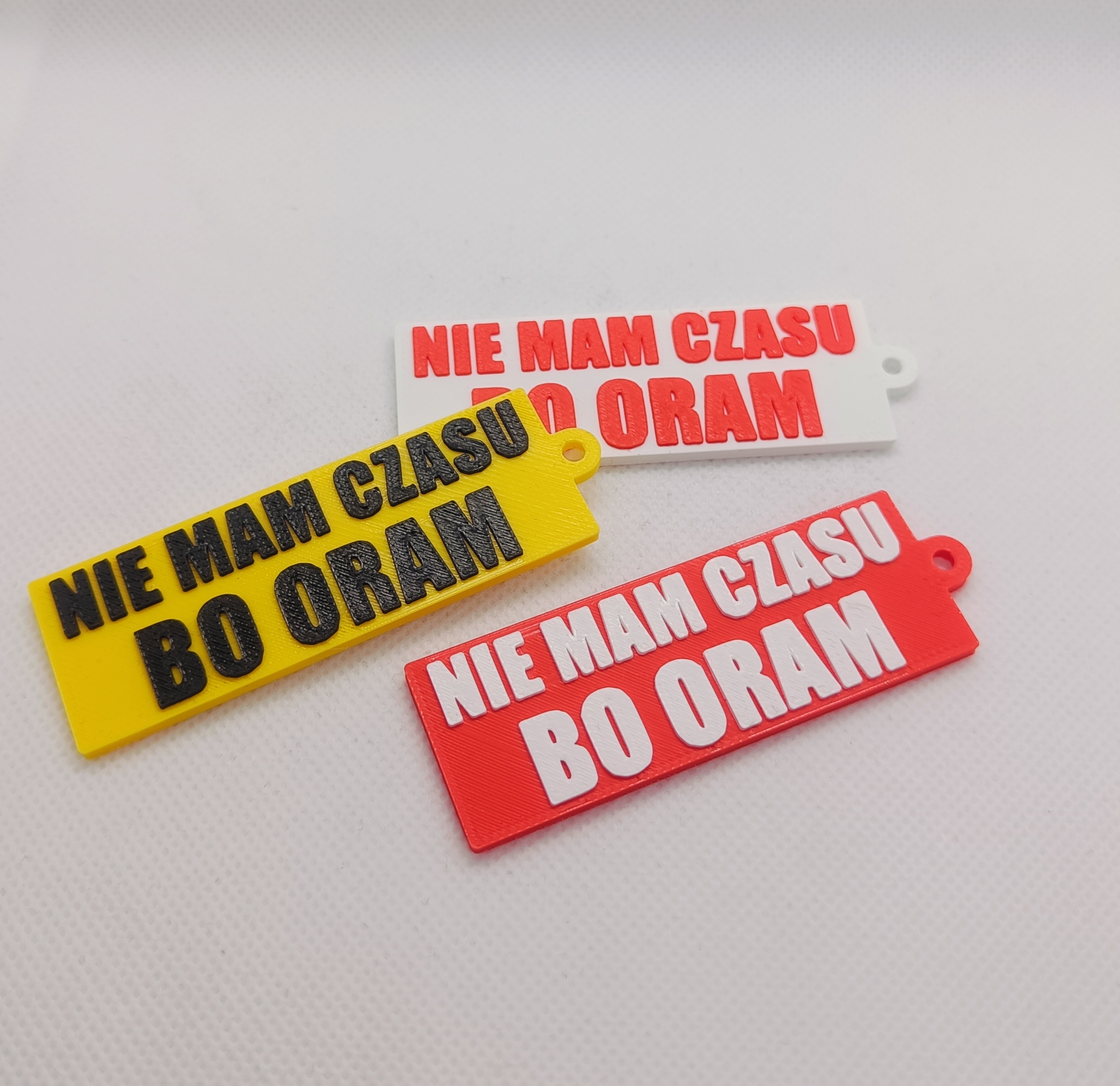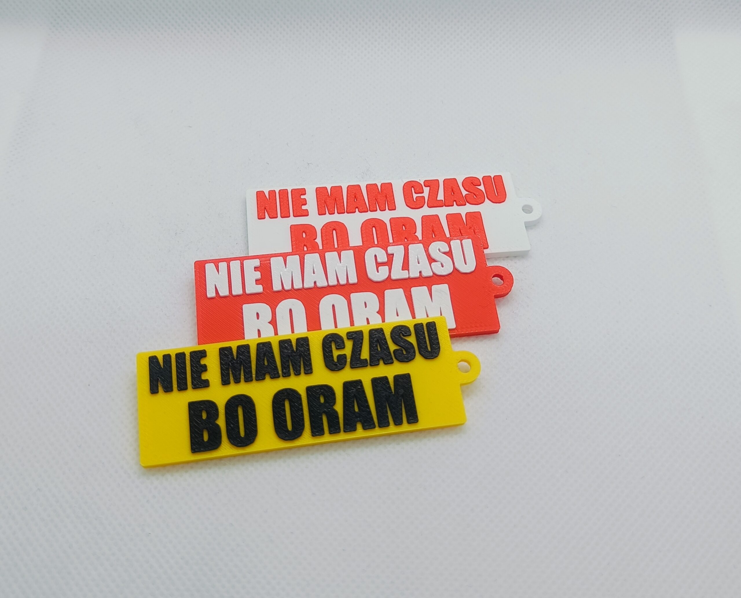 Brelok rolniczy z napisem „NIE MAM CZASU BO ORAM”. Wykonany z wytrzymałego plastiku PLA metodą druku 3D. Idealny gadżet dla rolnika lub praktyczny prezent.