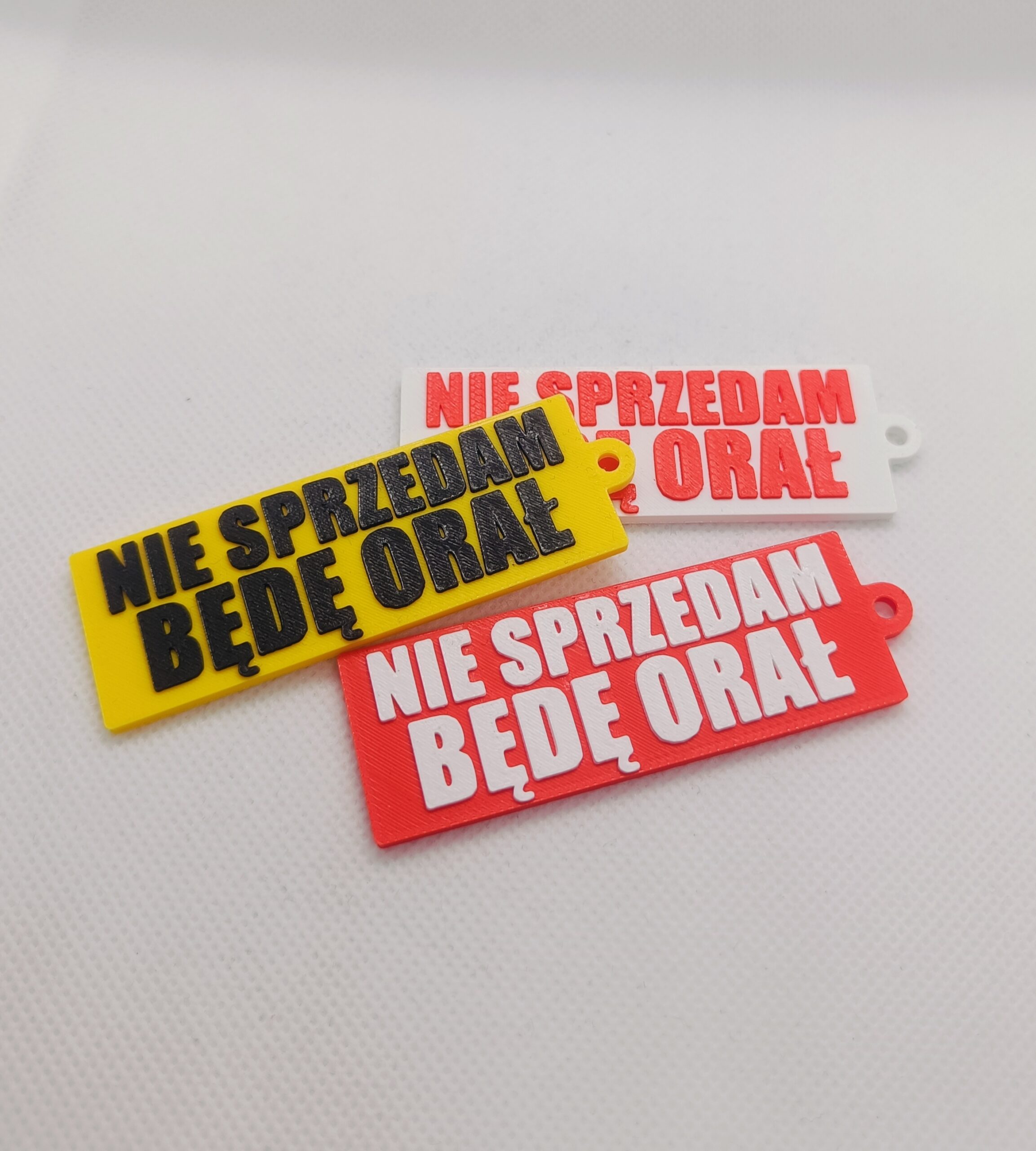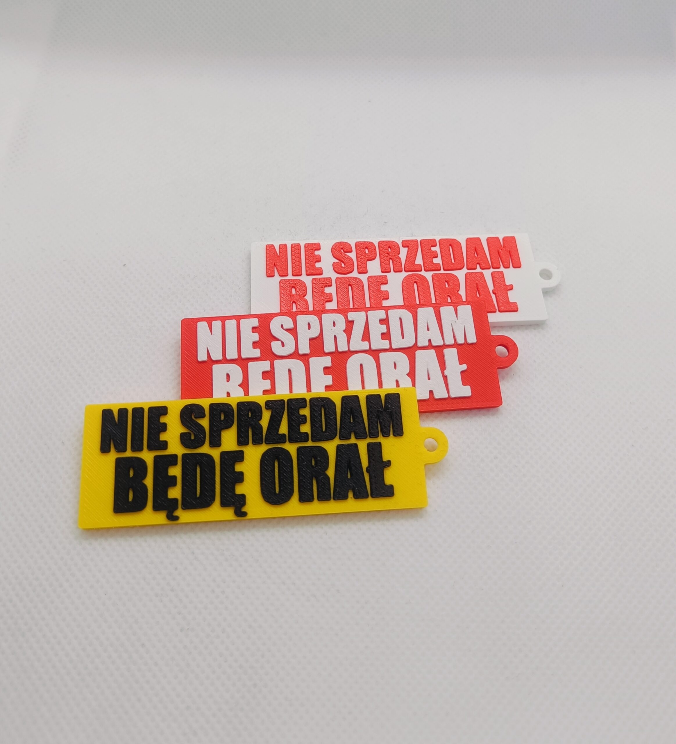 Brelok rolniczy z napisem „NIE SPRZEDAM BĘDĘ ORAŁ”. Wykonany z wytrzymałego plastiku PLA metodą druku 3D. Idealny gadżet dla rolnika lub praktyczny prezent.