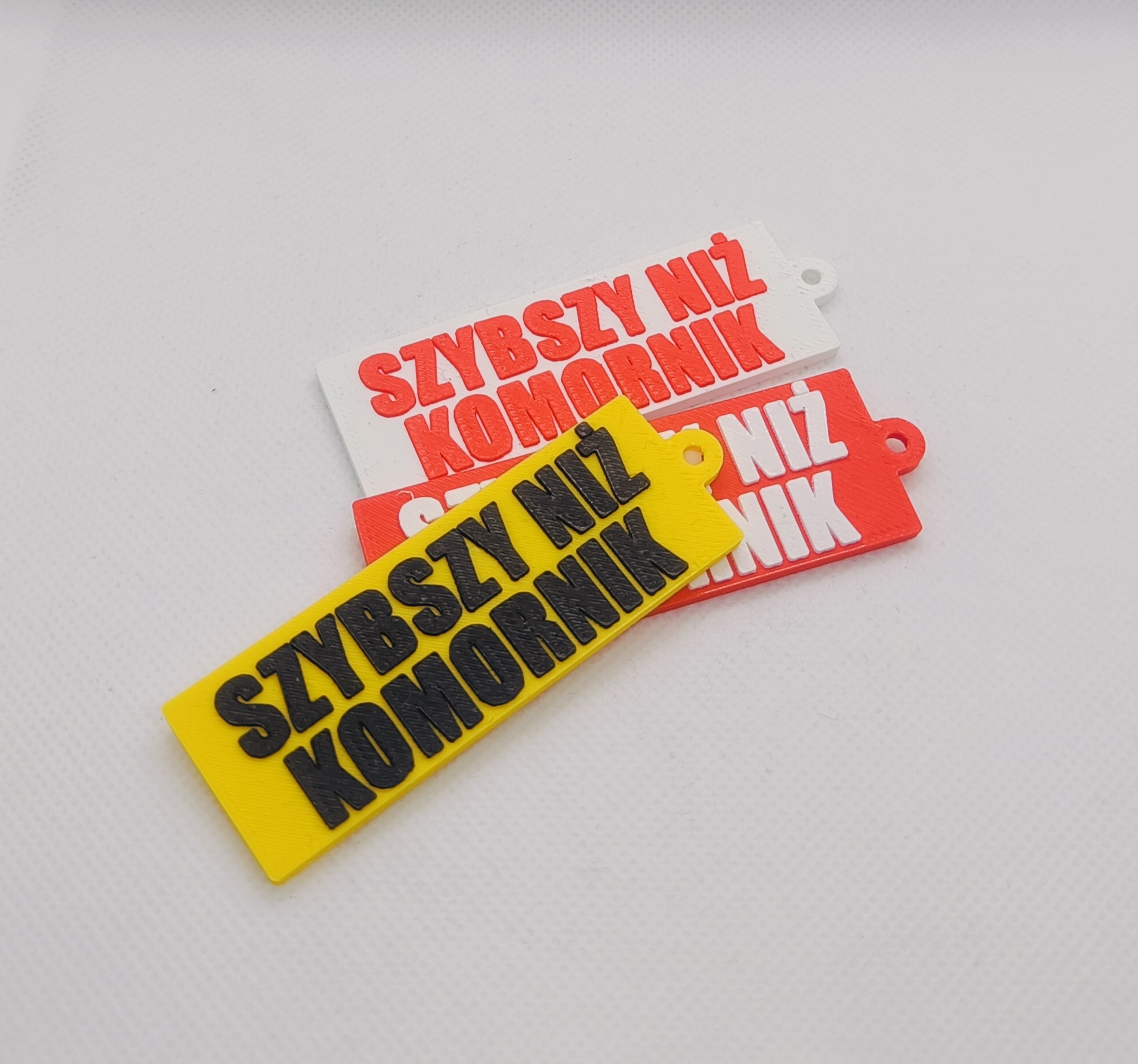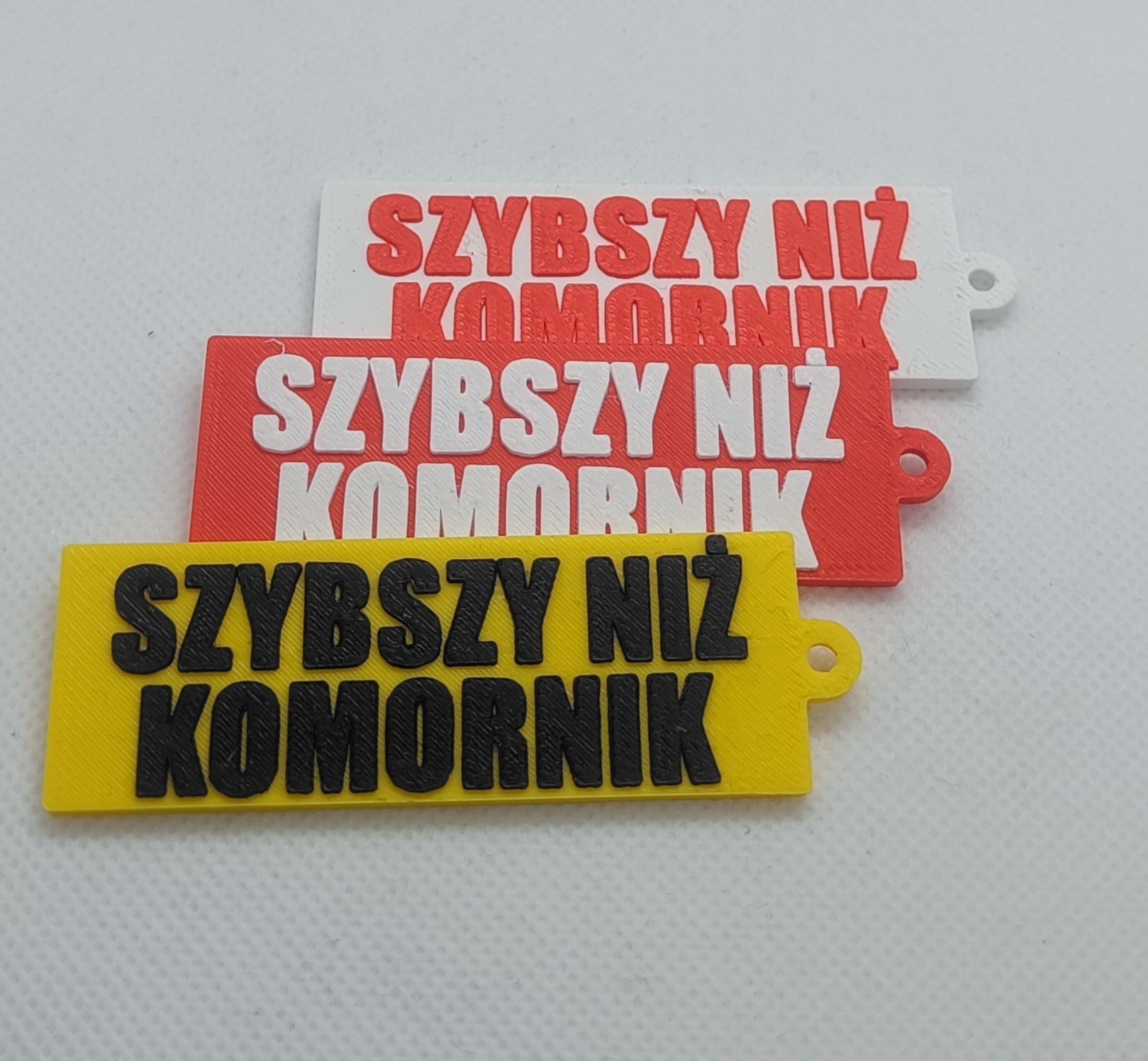 Brelok rolniczy z napisem „SZYBSZY NIŻ KOMORNIK”. Wykonany z wytrzymałego plastiku PLA metodą druku 3D. Idealny gadżet dla rolnika lub praktyczny prezent.